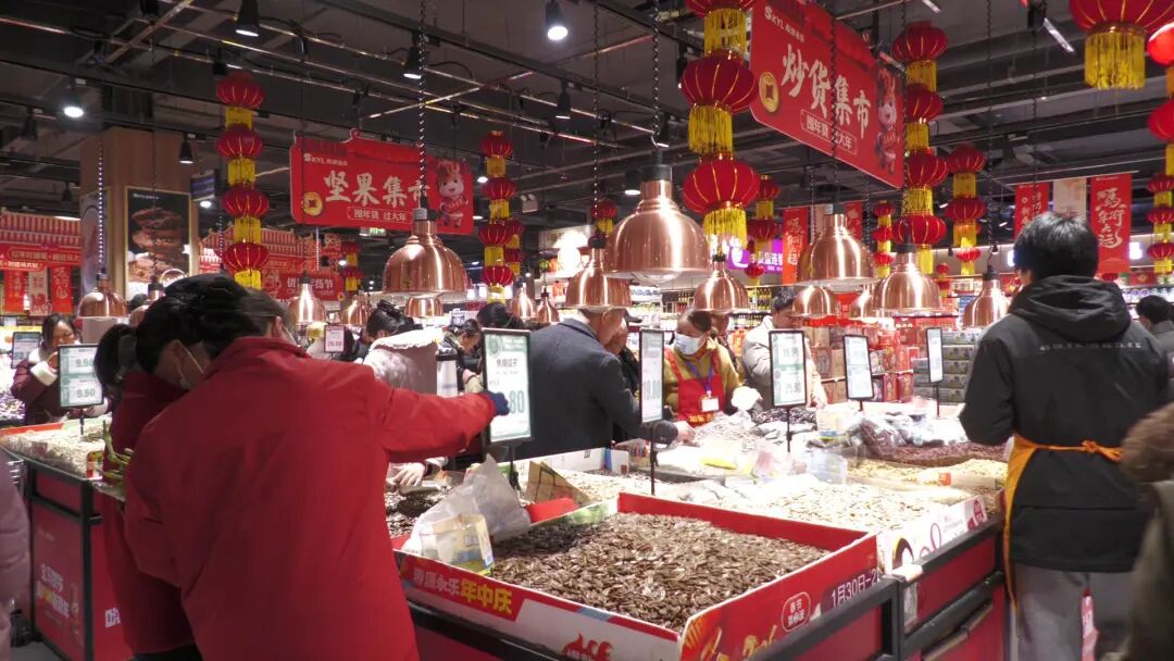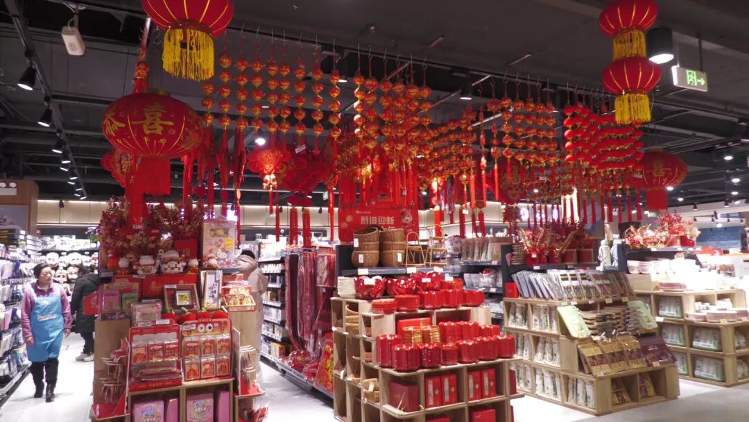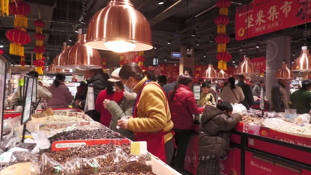 随着春节脚步临近,郧西各大商超、农贸市场迎来节前采购高峰,处处洋溢着红火喜庆、热闹祥和的节日氛围.在寿康永乐生活超市火红的中国结、灯笼和福字装点着各个角落,节日氛围格外浓厚.