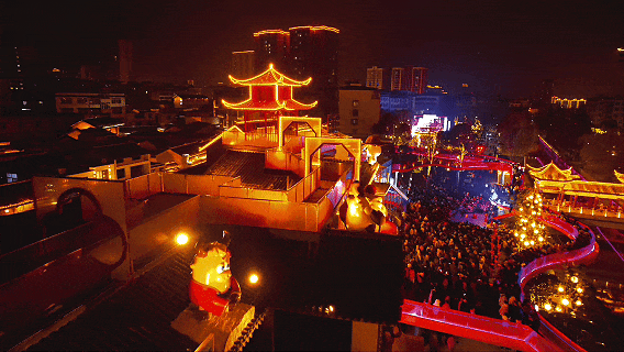 福门巍峨耸立,古街张灯结彩,橘色鱼灯轻摇,红色飘带桥如梦似幻,浓郁年味儿扑面而来,成为新春里一道靓丽风景线。