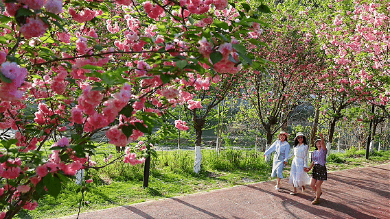 4月14日,漫步于天河水乡十里画廊花间步道,清风裹挟着淡淡花香,游人或是驻足拍照定格美景,或是身着汉服在花海中翩翩起舞……
