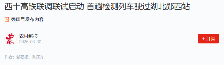 近日,县域经济网、农村新报、极目新闻、长江云新闻、湖北日报客户端等多家媒体先后刊发《湖北十堰郧西县“联调联试”助力城市“蝶变”》《西十高铁联调联试启动首趟检测列车驶过湖北郧西站》,聚焦西十高铁首趟专业检测列车驶过郧西站,标志着全线进入开通运营倒计时。
